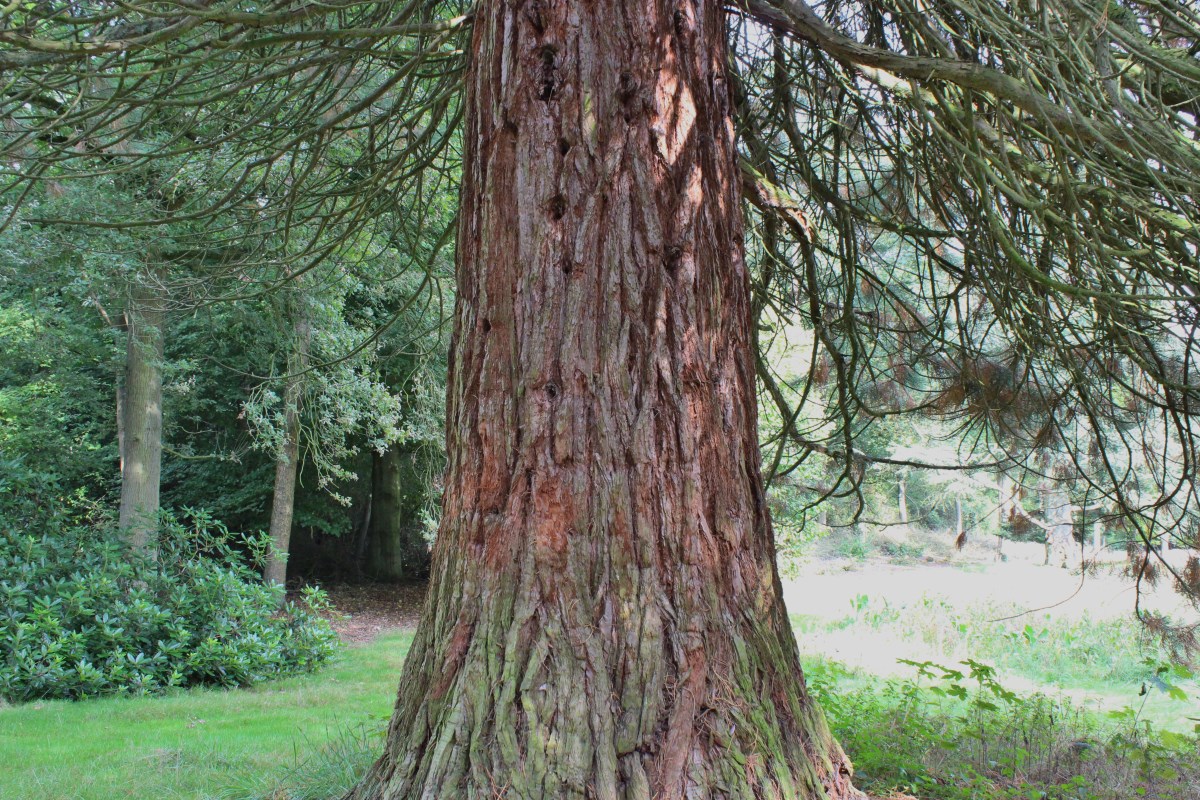 Stam robuust en naar boven toe taps toelopend, tot 90 m hoog en 7 m in doorsnede. Schors donker roodbruin, diep gegroefd en sponzig vezelig.