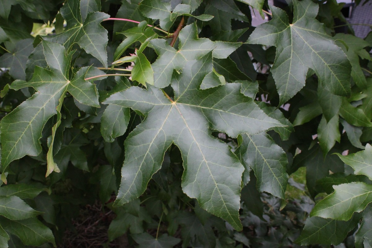Bladeren glanzend, handvormig met 5 (zelden 7) lobben en grof gezaagde rand, aan de onderzijde behaard bij de nerven.