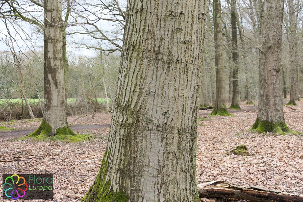 Tot 35 m hoge boom met brede koepelvormige kroon en vertikaal ondiep gegroefde, grijsbruine schors.