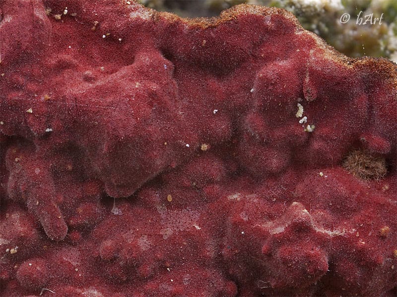 Rozerood, korstvormig vruchtlichaam, met bruine gladde, uitstekenden setae (haartjesachtige orgaantjes, zie detailfoto), jong met gelige randen.